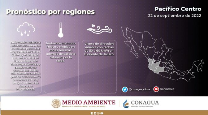 Morelia Michoacán, 22 de septiembre de 2022.- La Secretaría de Gobierno, a través de la Coordinación Estatal de Protección Civil invita a las y a los michoacanos a tomar medidas preventivas y de autocuidado ante la probabilidad de lluvias fuertes para las próximas horas. El Servicio Meteorológico Nacional informa sobre la presencia de varios fenómenos meteorológicos […]