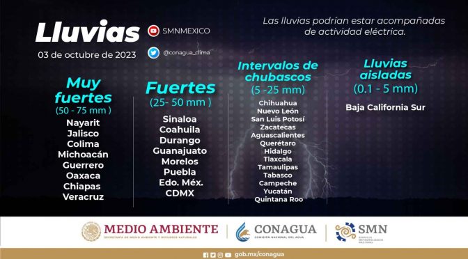 Morelia, Michoacán, 4 de octubre de 2023.- La Secretaría de Gobierno, a través de la Coordinación Estatal de Protección Civil invita a la población a tomar medidas preventivas y de autocuidado ante la probabilidad de lluvias fuertes para este día. Pronósticos del Servicio Meteorológico Nacional indican la presencia de varios fenómenos que interactúan en el territorio […]