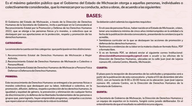 Morelia, Michoacán, 2 de diciembre de 2022.- El Gobierno del Estado de Michoacán, a través de la Secretaría de Gobierno, convoca a todas las personas defensoras y promotoras de derechos humanos y morales colectivas, a registrar candidato a obtener el Reconocimiento Estatal por la Promoción y Defensa de los Derechos Humanos 2022. Este reconocimiento, se otorga […]