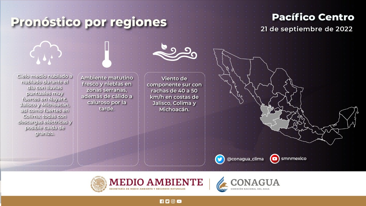 Morelia, Michoacán, 21 de septiembre de 2022.- Lluvias puntuales intensas se esperan para este día en gran parte de Michoacán, según los pronósticos del Servicio Meteorológico Nacional, de ahí la recomendación de la Secretaría de Gobierno, a través de la Coordinación Estatal de Protección Civil a seguir con las medidas de prevención y de autocuidado.