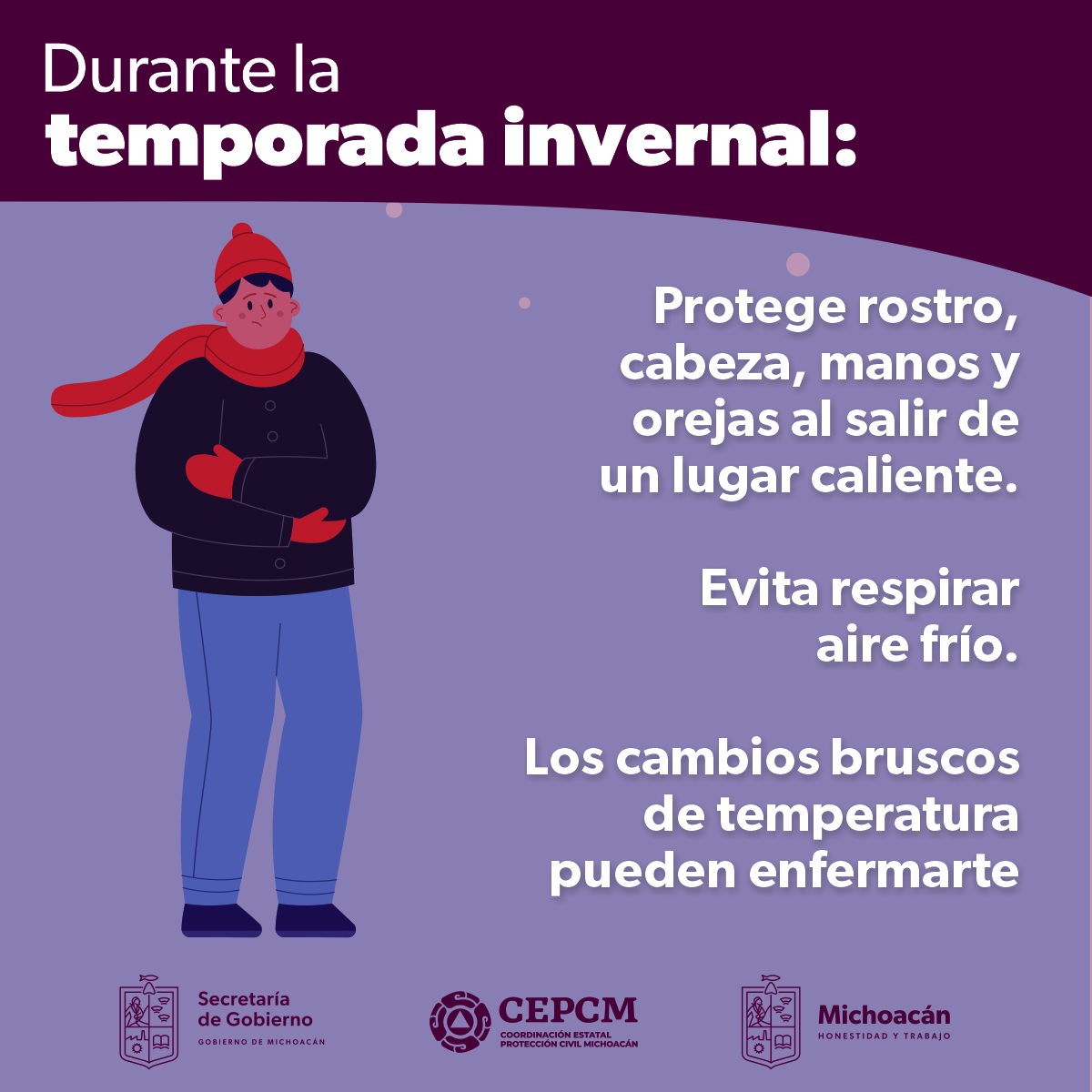 Morelia, Michoacán, 25 de noviembre de 2022.- La Secretaría de Gobierno, por conducto de la Coordinación Estatal de Protección Civil invita a las y a los michoacanos a tomar medidas de prevención y de autocuidado por las temperaturas frías en las próximas horas.