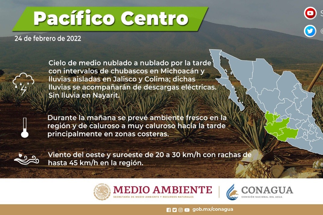 Asimismo, la entrada de humedad del Océano Pacífico provocará intervalos de chubascos de 5 a 25 milímetros en algunas zonas de la entidad.