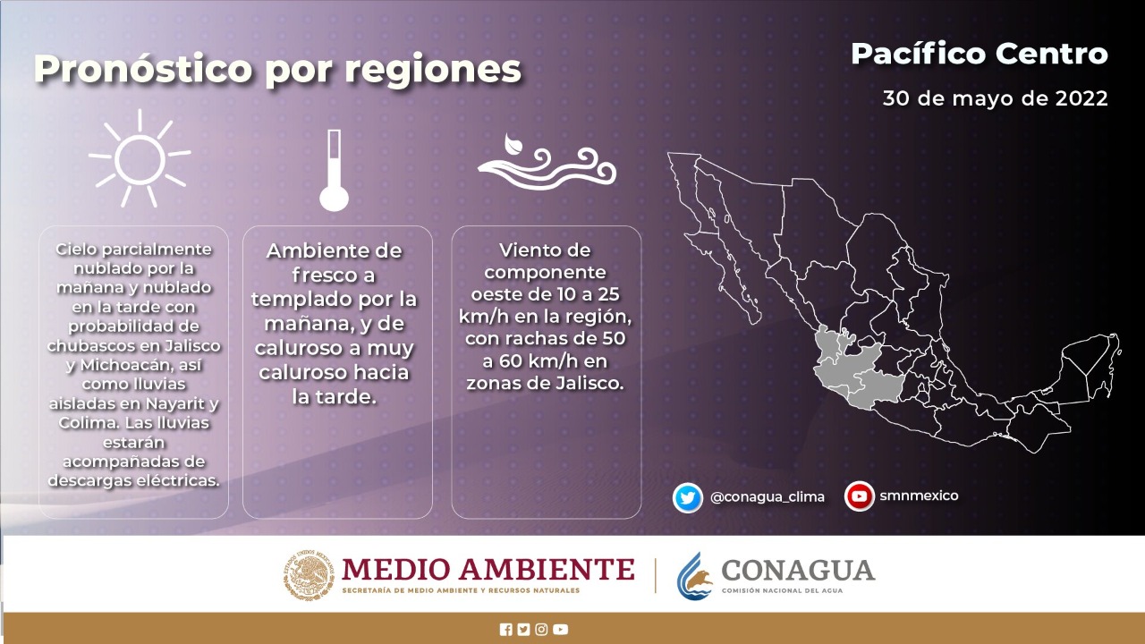 Morelia, Michoacán, 30 de mayo de 2022.- Ambiente caluroso durante el día y probabilidad de lluvias por la tarde noche se pronostican para este día, ante ello, pide PC estatal mantenerse alerta y seguir las recomendaciones para cada caso