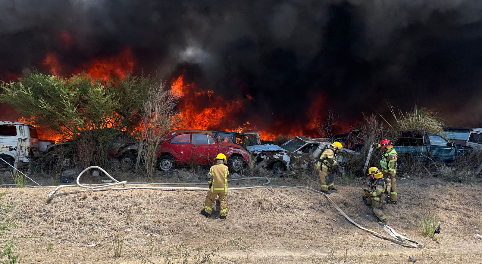 Morelia, Michoacán, 23 de junio de 2023.- La Secretaría de Gobierno a través de la Coordinación Estatal de Protección Civil en conjunto con agrupaciones de bomberos atienden el incendio en un corralón ubicado en la salida a Charo.