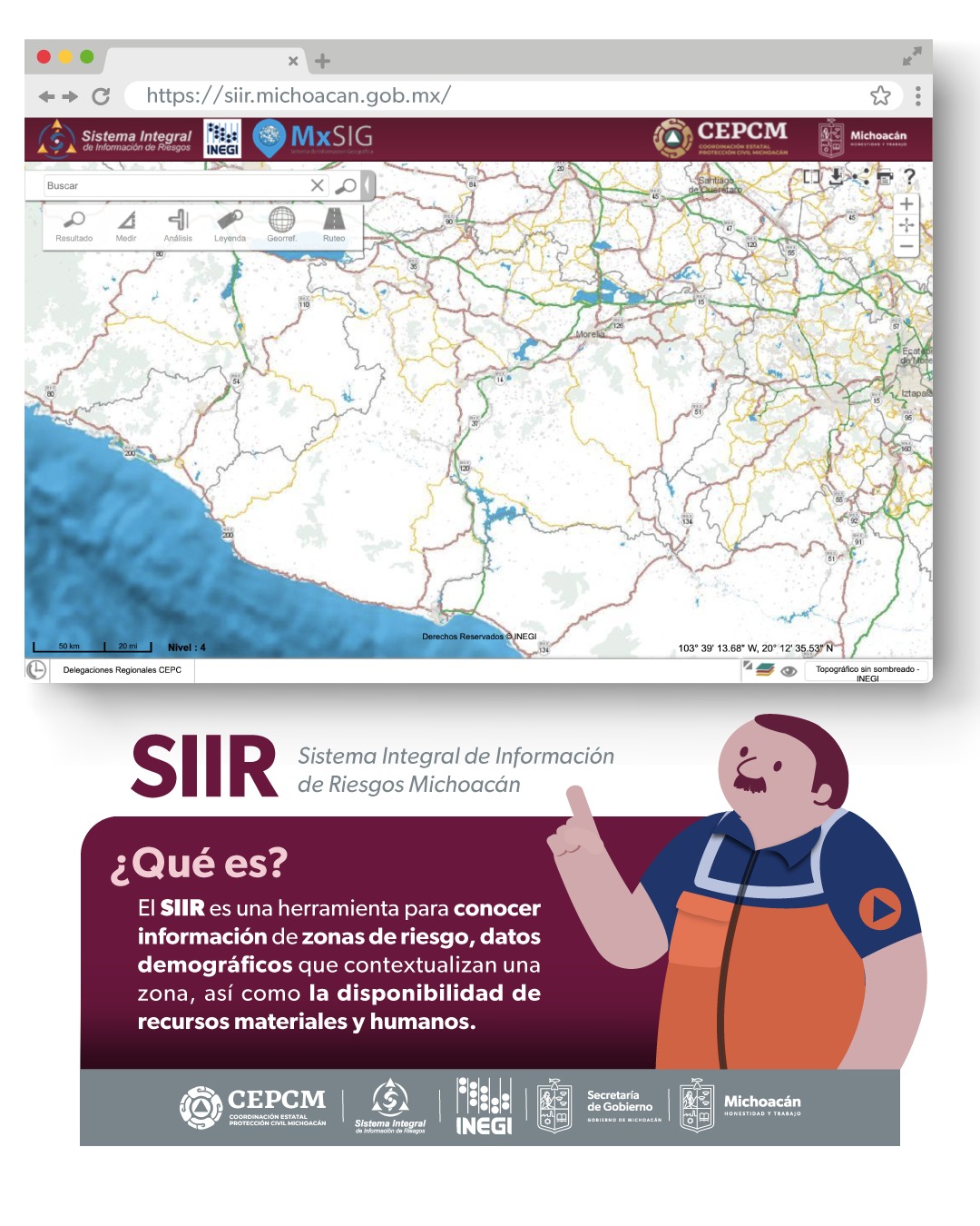 Morelia, Michoacán, 12 de junio de 2023.- Con el objetivo de homologar y contar con una base cartográfica única sobre riesgos y peligros para la población y el territorio de Michoacán, la Coordinación Estatal de Protección Civil con el respaldo del INEGI (Instituto Nacional de Estadística y Geográfica) cuentan con el Sistema Integral de Información de Riesgos (SIIR).