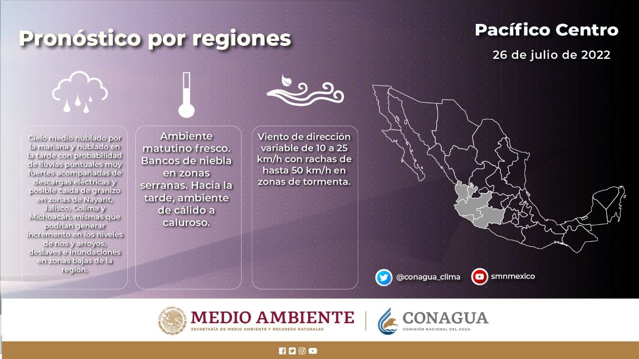 Morelia, Michoacán, 26 de julio de 2022.- La Secretaría de Gobierno a través de la Coordinación Estatal de Protección Civil, exhortan a la población a tomar precauciones ante el pronóstico de lluvias muy fuertes en el estado.