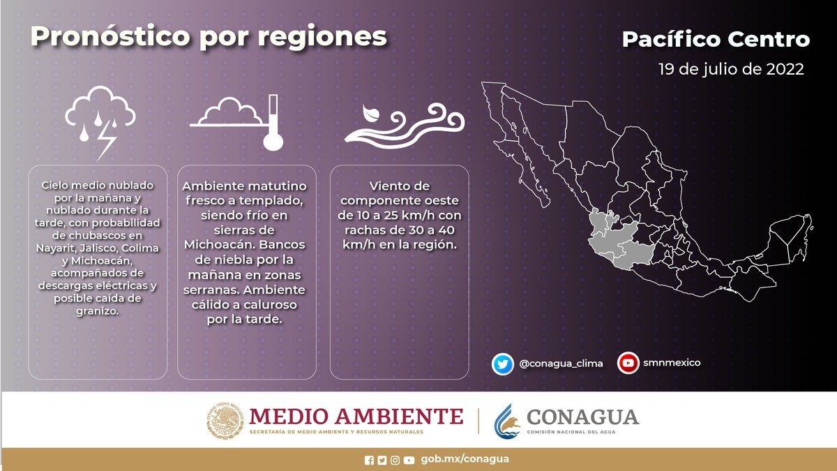 Morelia, Michoacán, 19 de julio de 2022.- La Secretaría de Gobierno, a través de la Coordinación Estatal de Protección Civil informa que, de acuerdo a pronósticos del Servicio Meteorológico Nacional (SMN), se esperan lluvias en Michoacán.