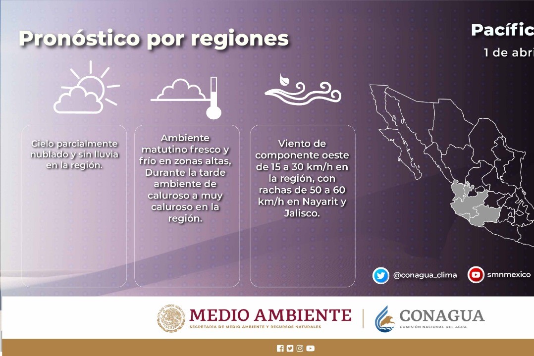 Tale condiciones climáticas, indica el pronóstico del Servicio Meteorológico Nacional, mantendrá el ambiente vespertino de caluroso a muy caluroso, por lo que se pronostican temperaturas máximas de 40 a 45 grados, específicamente en zonas de la Tierra Caliente y Costa del estado.