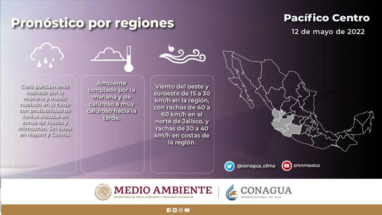 Por otro lado, un canal de baja presión sobre la Mesa Central, así como en el sureste de México y la entrada de humedad de ambos océanos, generarán hacia la tarde, cielo parcialmente nublado y posibles lluvias aisladas acompañadas de descargas eléctricas.