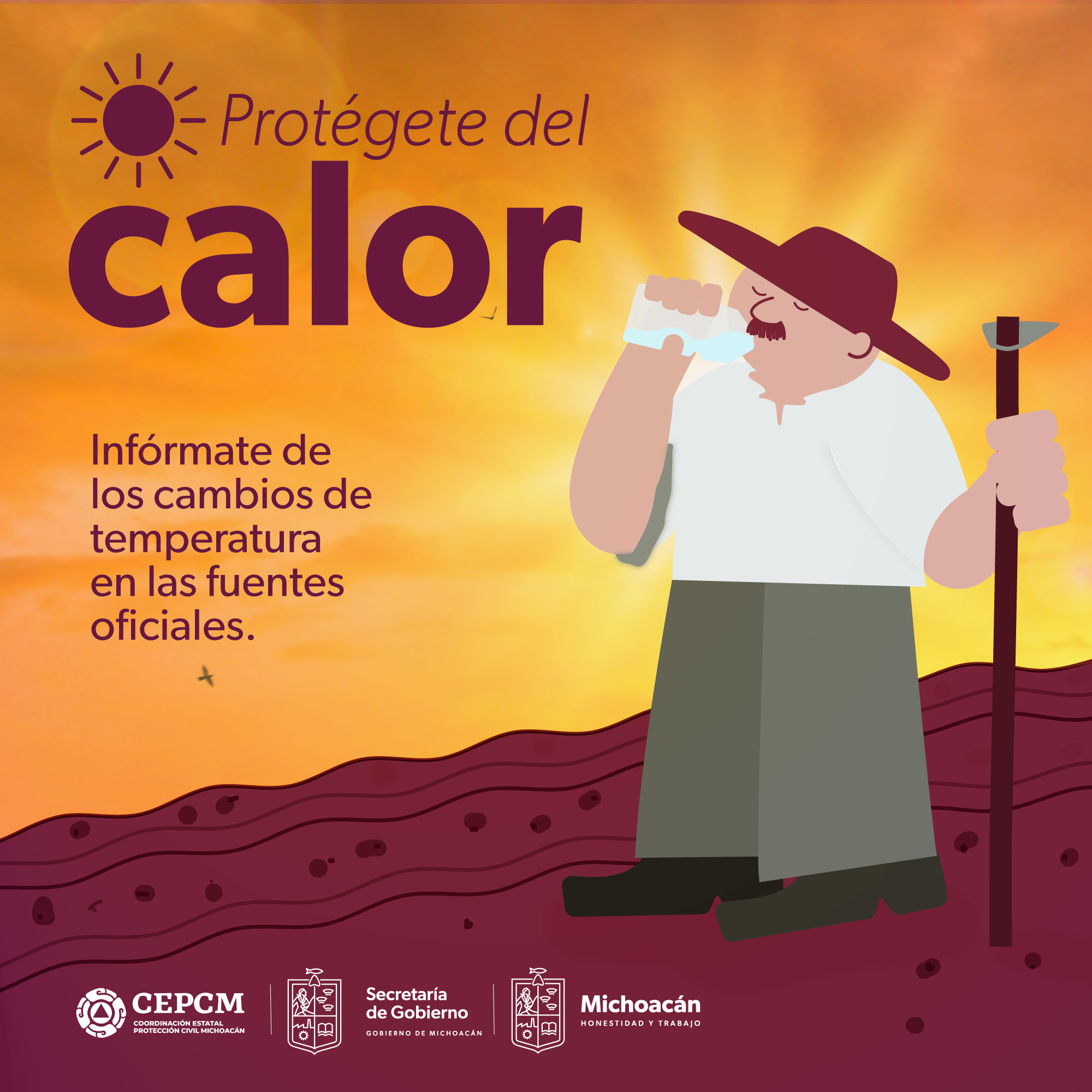 Morelia, Michoacán, 24 de marzo del 2023.- Ante las condiciones de calor que se esperan para este fin de semana en gran parte del estado de Michoacán, la Secretaría de Gobierno, por conducto de la Coordinación Estatal de Protección Civil, exhorta a la población a tomar medidas preventivas y de autocuidado.