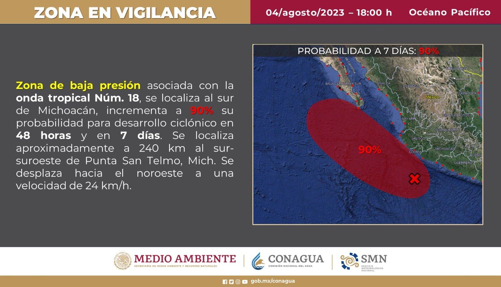 Morelia, Michoacán a 4 de agosto de 2023.- Tras el paso de la onda tropical número 18, se prevén lluvias intensas en la mayor parte de Michoacán. Ante el aviso especial por lluvias intensas, viento y oleaje elevado, lo que podría desarrollar actividad ciclónica, razón por la cual se invita a extremar precauciones.